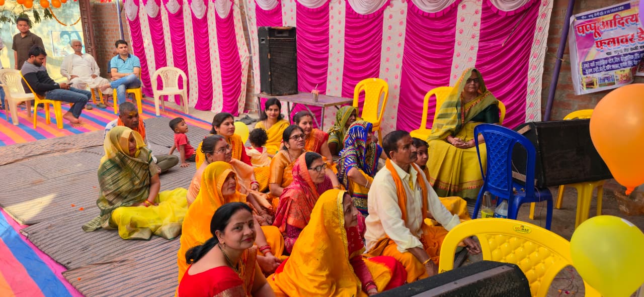 ​”भक्ति में सराबोर: शाहपुर गांव में आयोजित श्रीमद्भागवत कथा के दौरान भगवान श्रीकृष्ण की बाल लीलाओं का प्रसंग सुनते भाव-विभोर श्रद्धालु।”