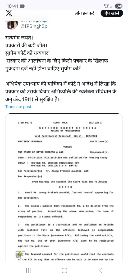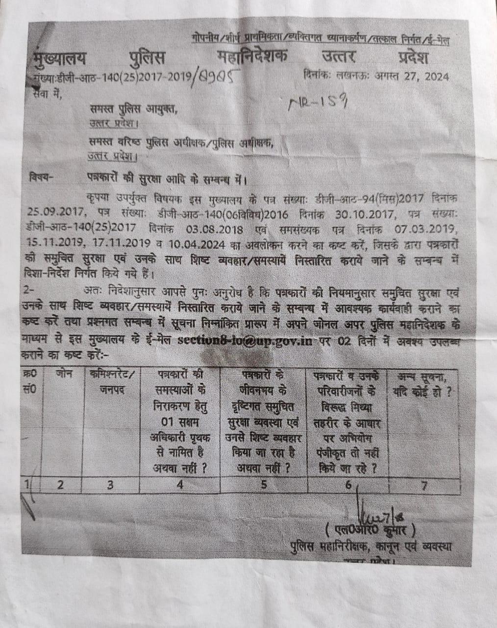 जबकि मनानीय सर्वोच्च न्यायालय सुप्रीम कोर्ट का पारित आदेश खबर प्रकाशित के आरोप पर पत्रकारों के खिलाफ अभियोग पंजीकृत नहीं व योगी सरकार व पुलिस विभाग उच्च अधिकारी DGP के सख्त आदेशों के अनुसार पत्रकारों का सम्मान पुलिस विभाग को करना होगा और बिना जानकारी उनके ऊपर कारवाही व गिरफ्तार नहीं किया जा सकता लेकिन वह आदेश कागज के पन्नों में ही सिमट कर ही रह गए। और आदेश हवा हवाई नजर आ रहा है।